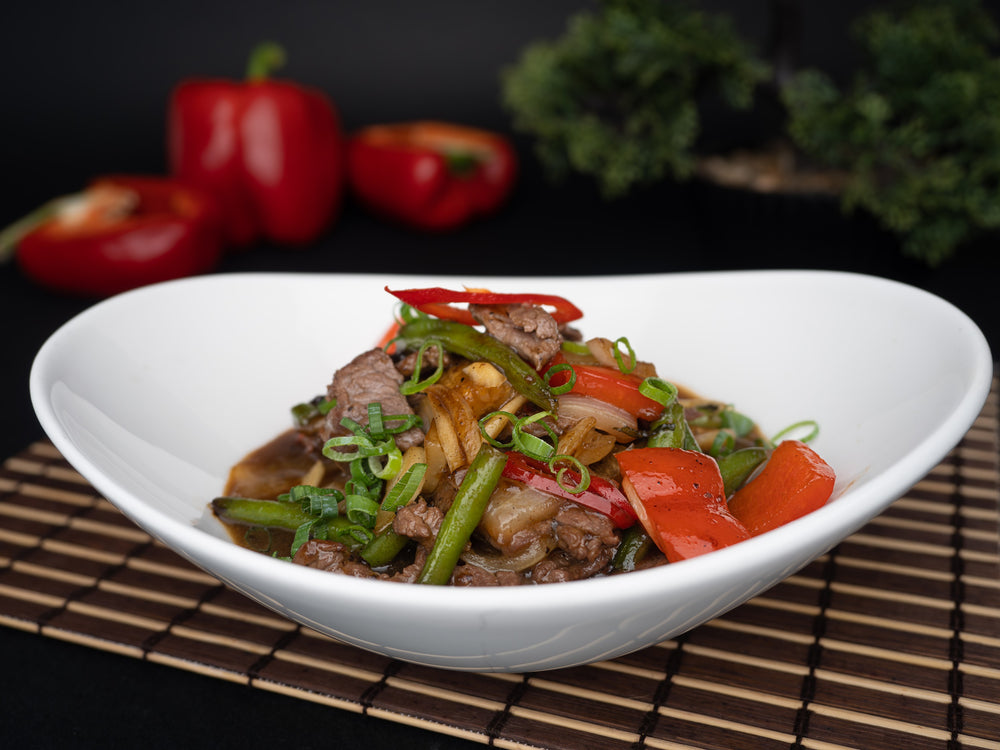 Descoperă deliciul intens al Black Pepper Beef! Bucăți suculente de carne de vită, gătite perfect într-un sos bogat de piper negru, oferă o experiență gustativă irezistibilă. Savurează aroma și textura în fiecare mușcătură.