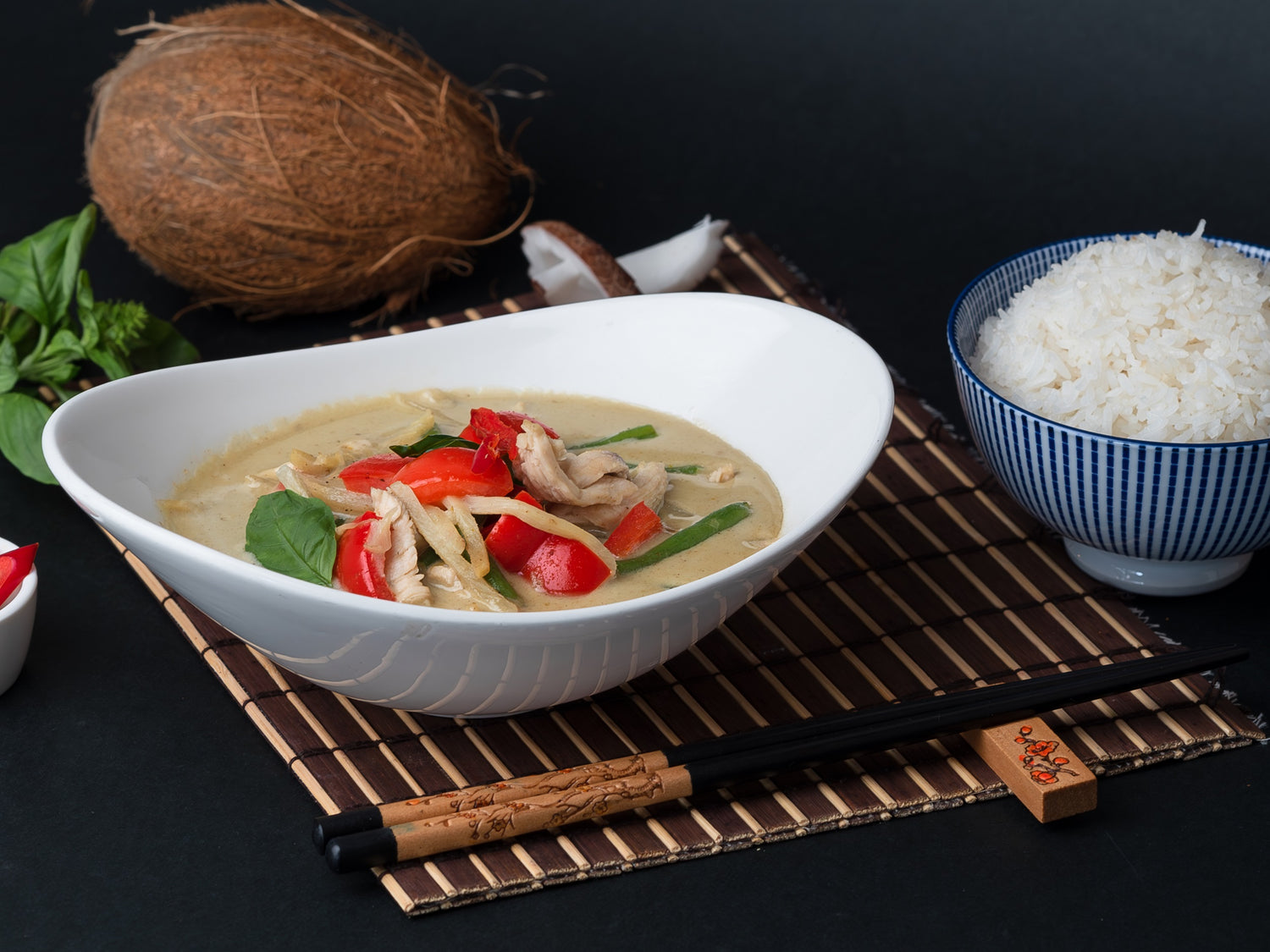 CURRY-UL ROȘU este preparat cu pastă de curry roșie, lapte de cocos, felii de bambus, ardei roșu, frunze proaspete de busuioc și fasole verde. Acesta conține ardei iute uscat pentru a-i da culoarea r