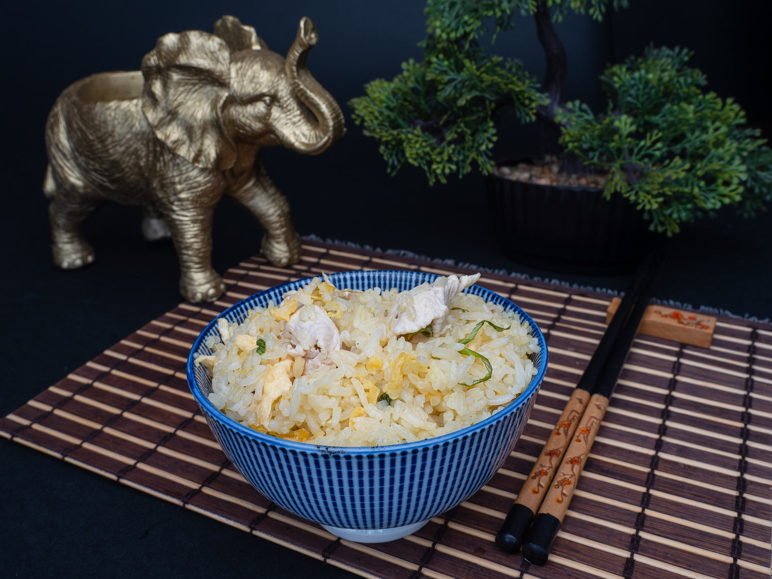 NASI GORENG este un preparat din Orez Jasmine prăjit indonezian cu usturoi, varză, ou prăjit și chipsuri de creveți.NASI GORENG is a indonezian fried Jasmine Rice dish with garlic, cabbage, fried egg and prawn crackers.
