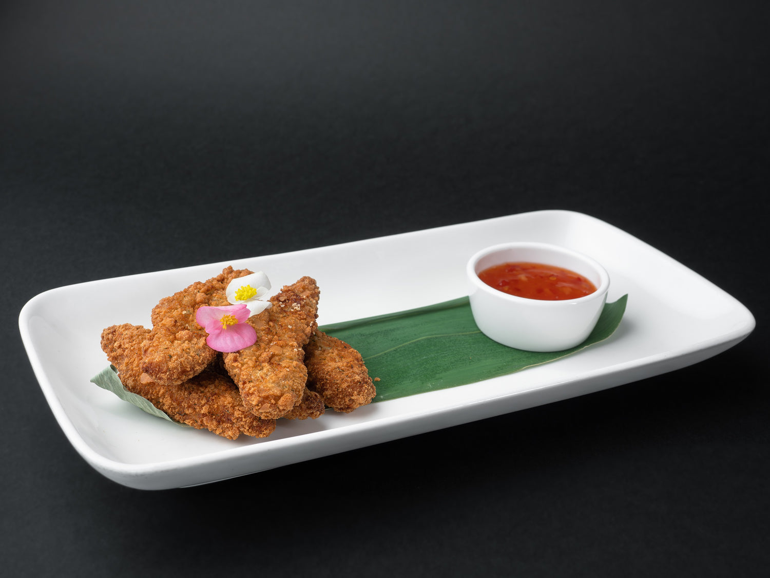 Pieces of chicken rolled in dough and fried. Served with sauce, Sweet-Sour or Chilli-Sweet (mild).