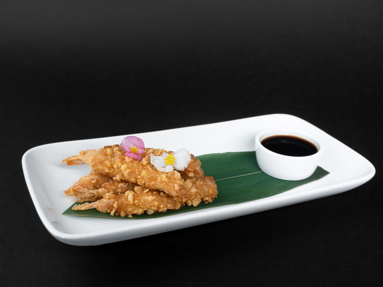 Creveți prăjiți, tavăliți usor în aluat și usor acoperiți în pesmet panko. Serviti cu sos de Tamarind.