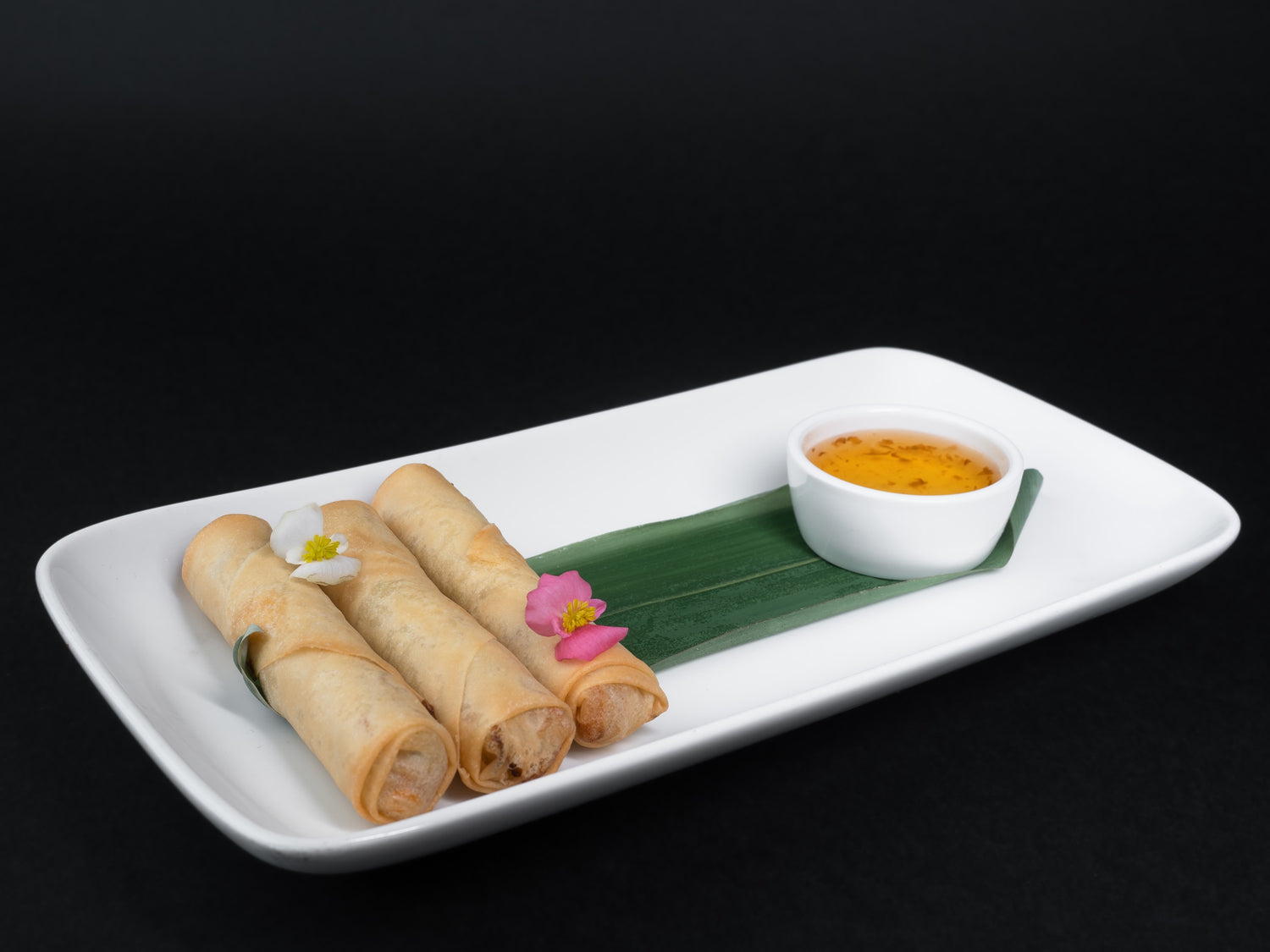 Pachetele de primavară cu fasole Vermicelli, castane de apă, varză și morcovi, fierte în ierburi thai și împachetate în aluat foietaj. Servite cu sos de prune.