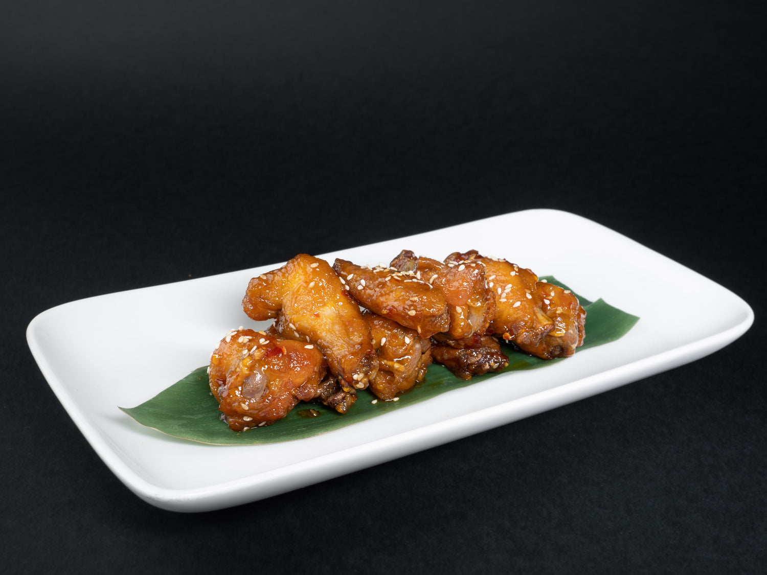 Chicken wings tossed in thai sauce with white sesame seeds.