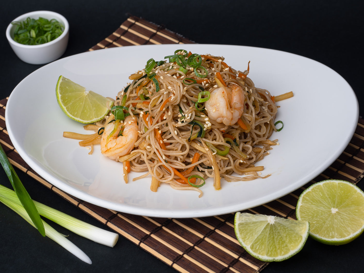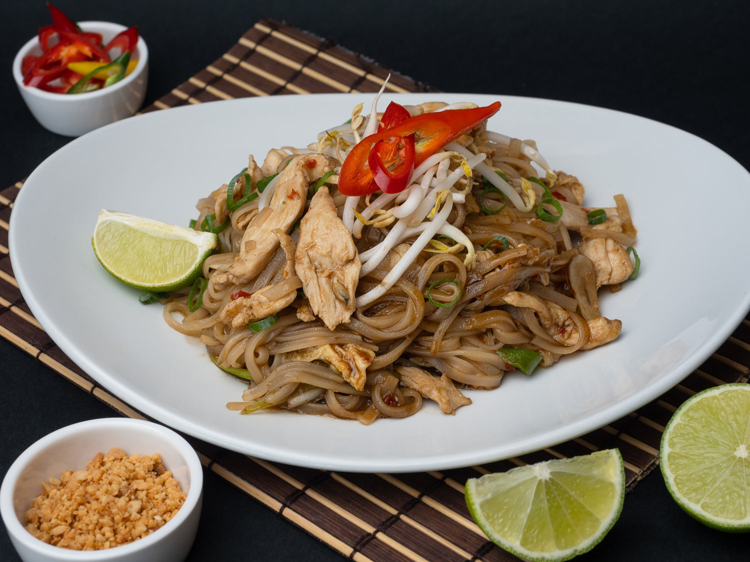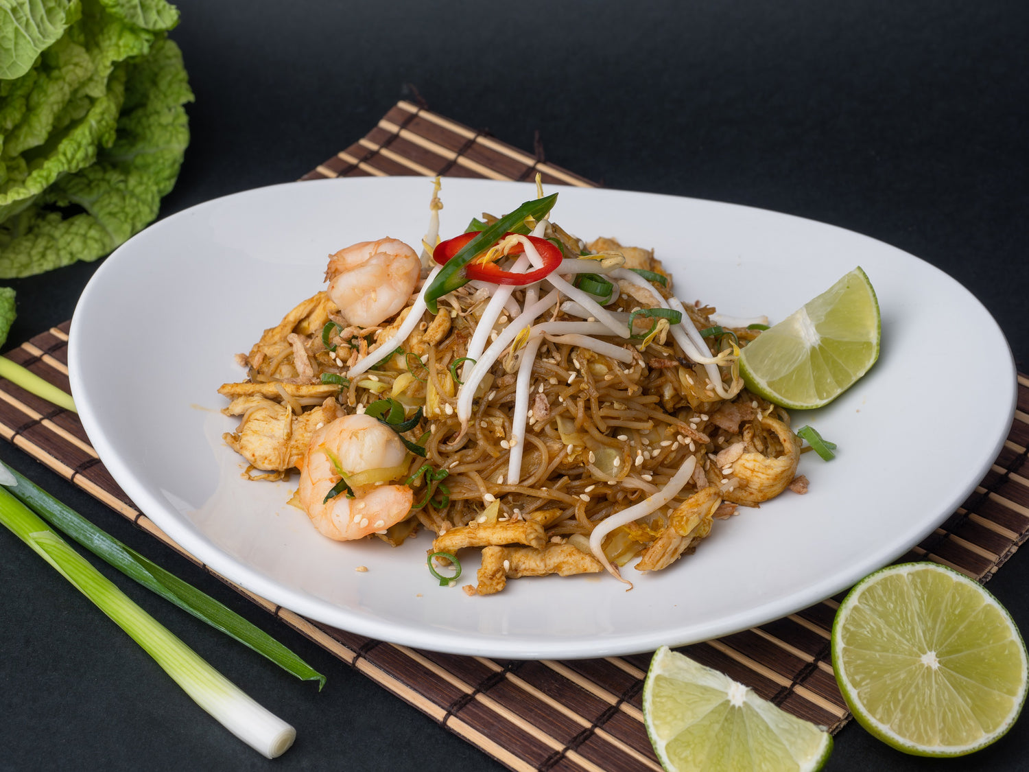 PHAD THAI este unul dintre cele mai populare mâncăruri din Thailanda, cu tăiței din orez, alune măcinate, ou, ceapă verde, muguri de fasole, lime, coriandru, usturoi și sos dulce-acrișor. PHAD THAI i