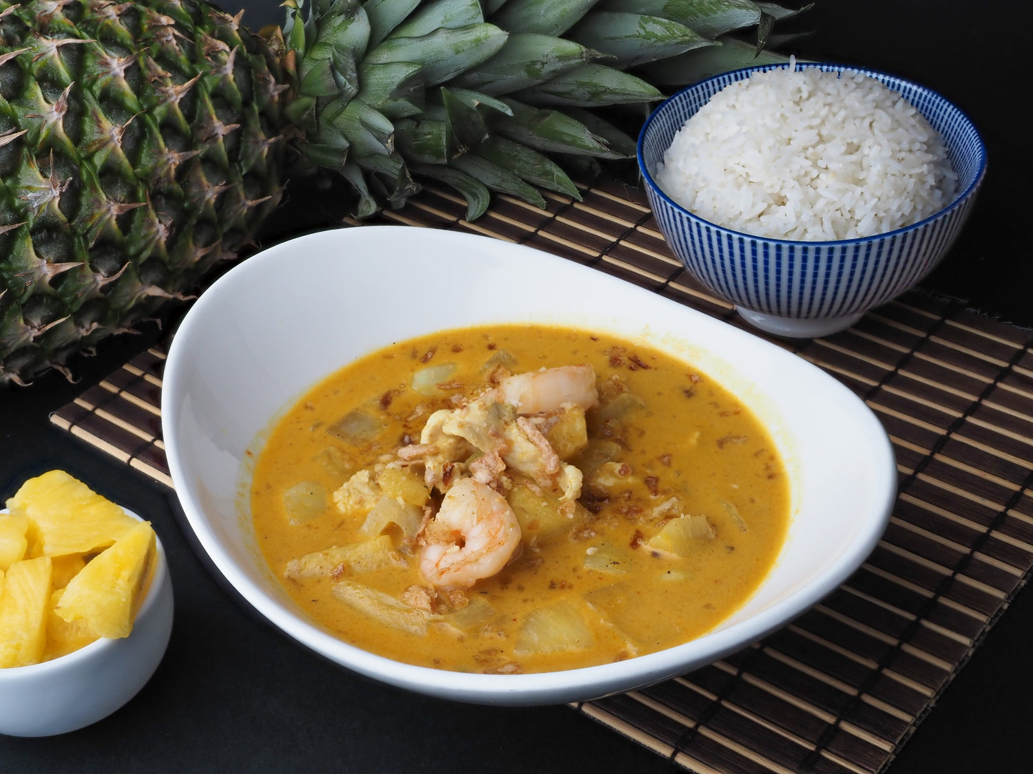 CURRY-UL GALBEN este un preparat cremos cu lapte de cocos, ceapă, cartofi, ananas și presărat cu ceapă prăjită. Servit cu Orez Jasmine. YELLOW CURRY is a dish made creamy with yellow curry with cocon