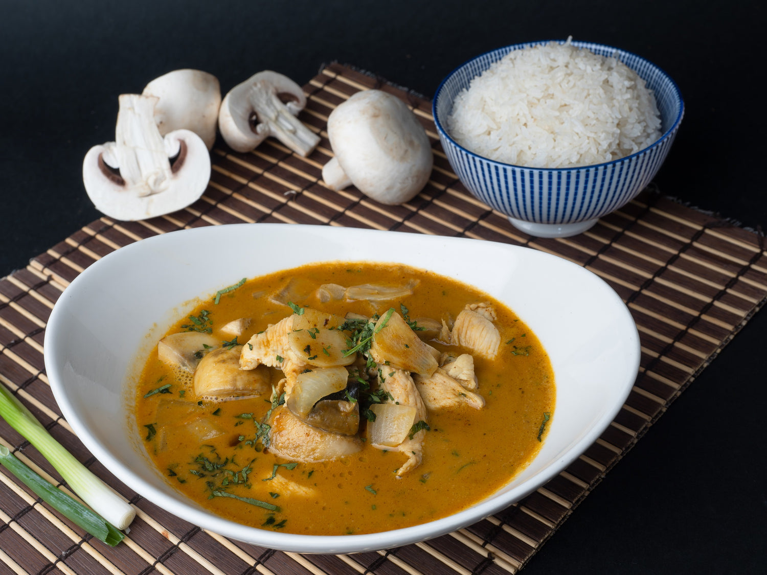Curry-ul Malaysian cu pui este preparat cu pastă de curry malaysian, pui, usturoi, ciuperci, ceapă, coriandru și lapte de cocos. Servit cu Orez Jasmine si iaurt.