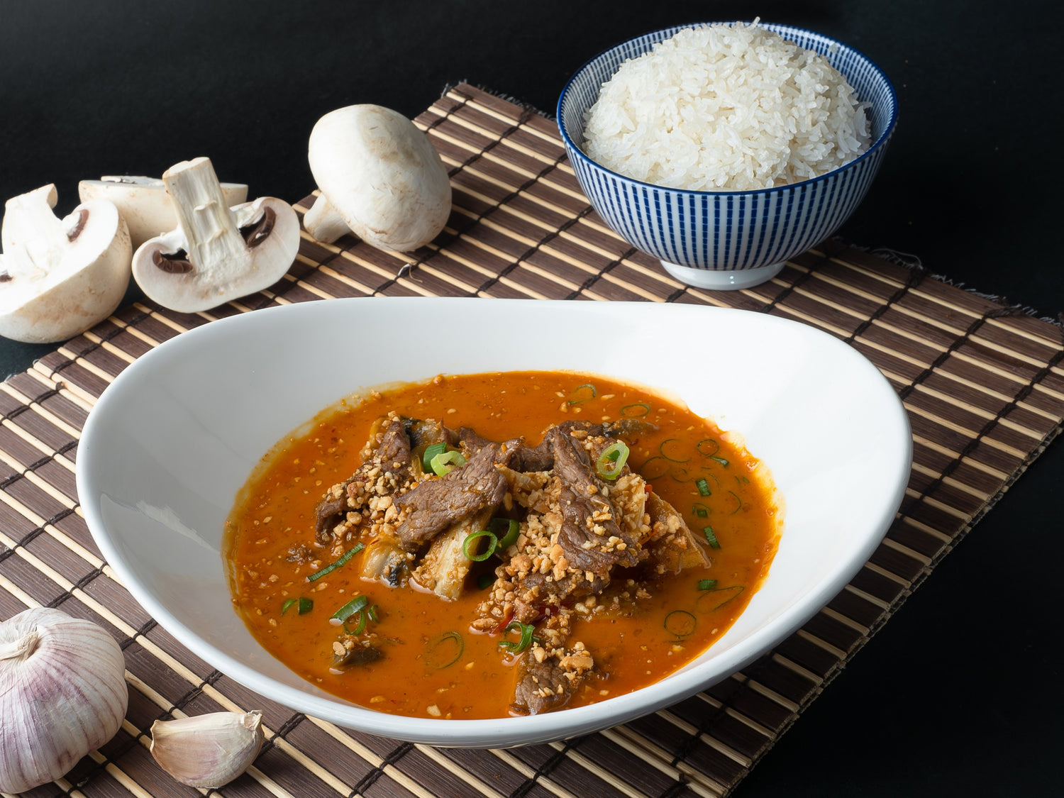 CURRY-UL MALAYSIAN este preparat cu pastă de curry malaysian, usturoi, ciuperci, ceapă, coriandru și lapte de cocos. Servit cu Orez Jasmine si iaurt. MALAYSIAN CURRY is a dish made with malaysian cur