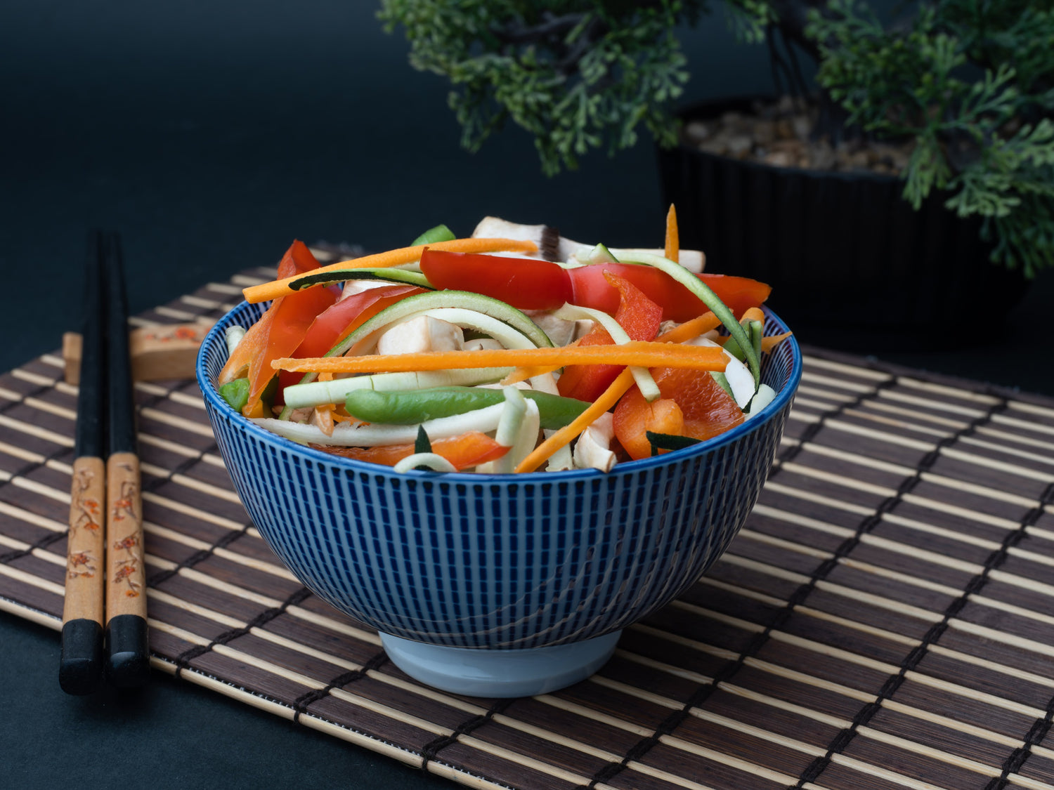 WOK SPECIAL este un preparat din tăiței din ou cu morcovi, zuchinii, felii de bambus, semințe de susan, ceapă verde, lime și sos sărat de soia. WOK SPECIAL is an egg noodles dish with carrots, zuchin