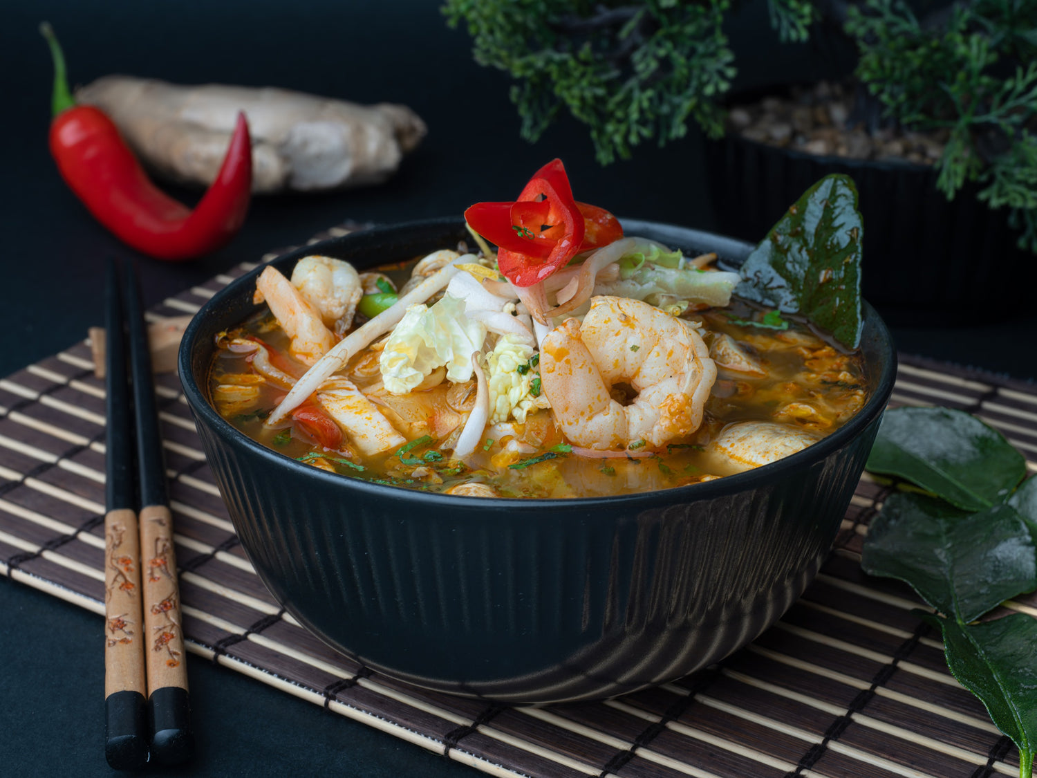 Supă TOM YUM este picant-acrișoară aromată cu lemon grass, fasole verde, suc proaspăt de lămâie, frunze de kaffire lime, coriandru si ciuperci champignon. TOM YUM Soup Spicy and sour flavored with le