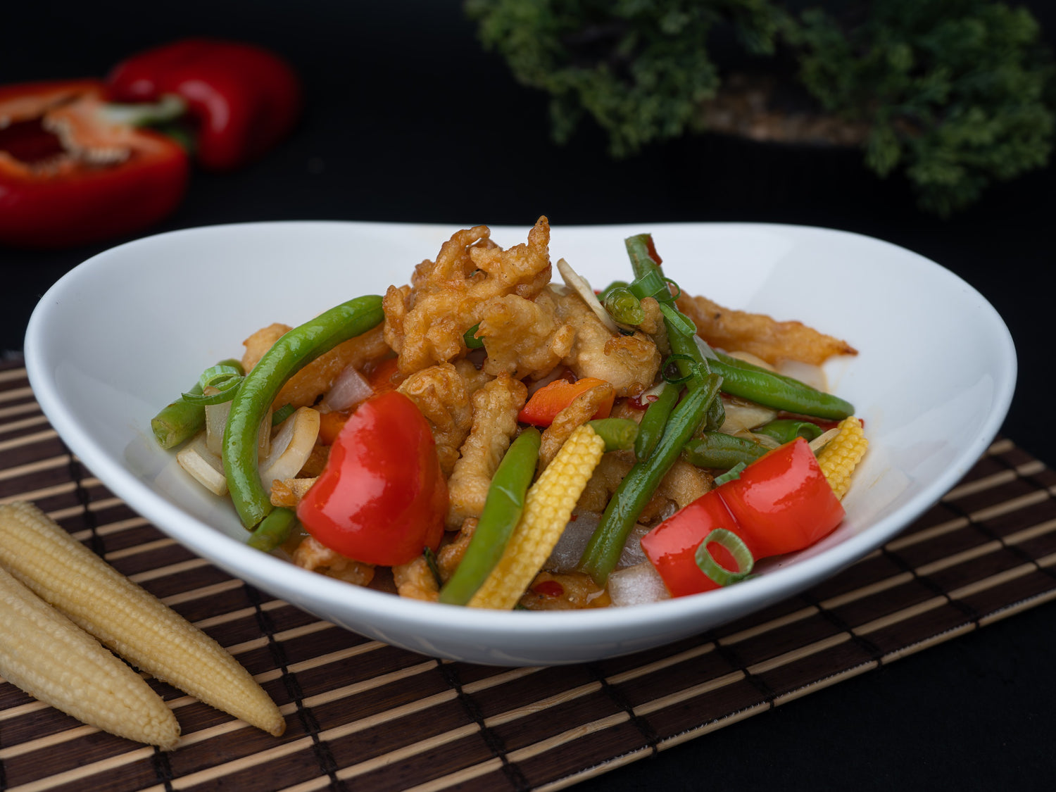 HONG KONG este un preparat tras la tigaie cu ardei roșu, ceapă, fasole verde, frunze proaspete de busuioc și baby porumb. Servit cu Orez Jasmine sau Tăitei. HONG KONG is a stir-fried dish made with r