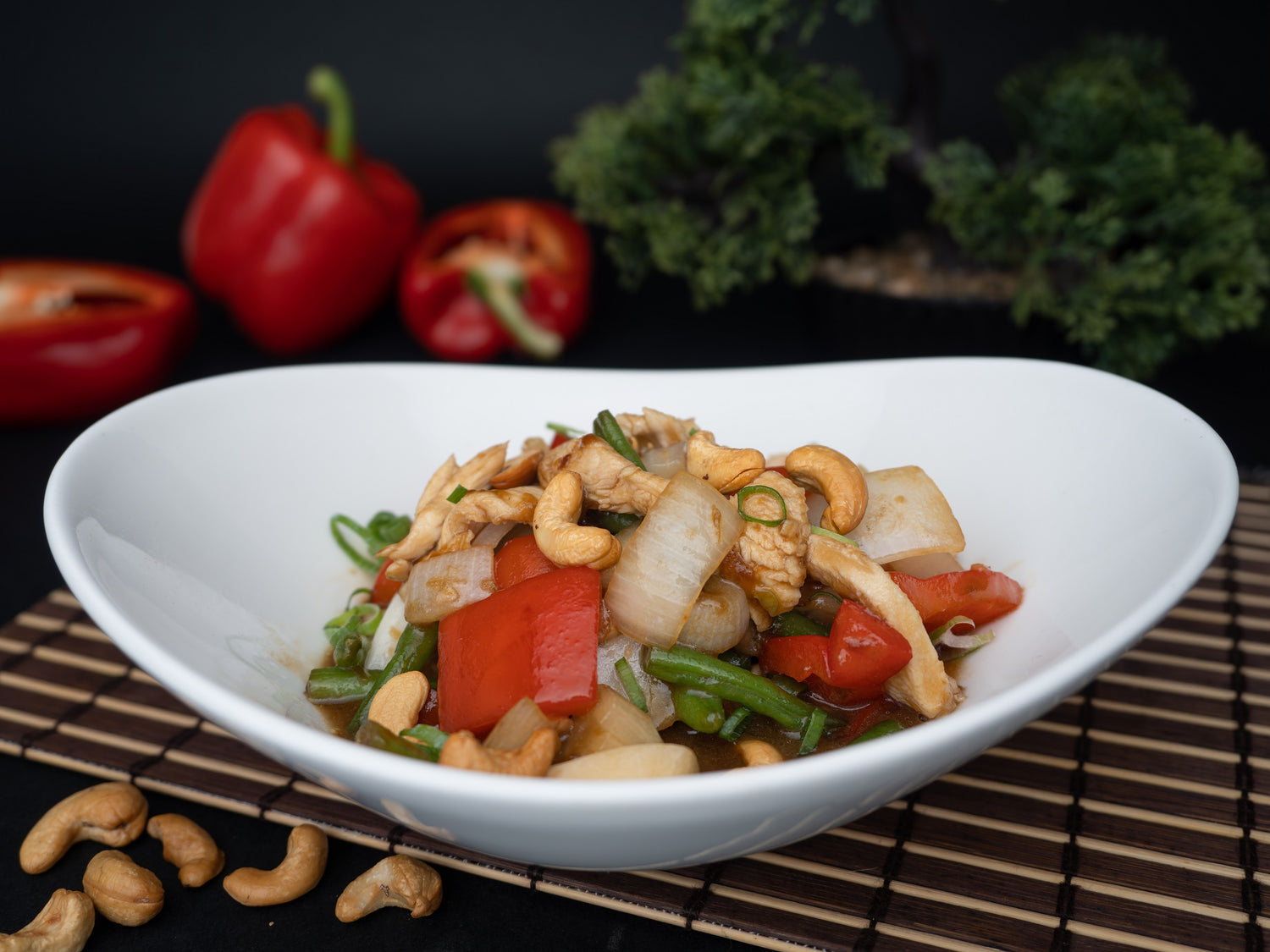 THAI CHASEW este un preparat tras la tigaie cu caju, ceapă, ardei, ceapă verde, fasole verde și usturoi. Servit cu Orez Jasmine sau Tăitei. THAI CHASEWis a stir-fried dish made with cashew nuts, onio