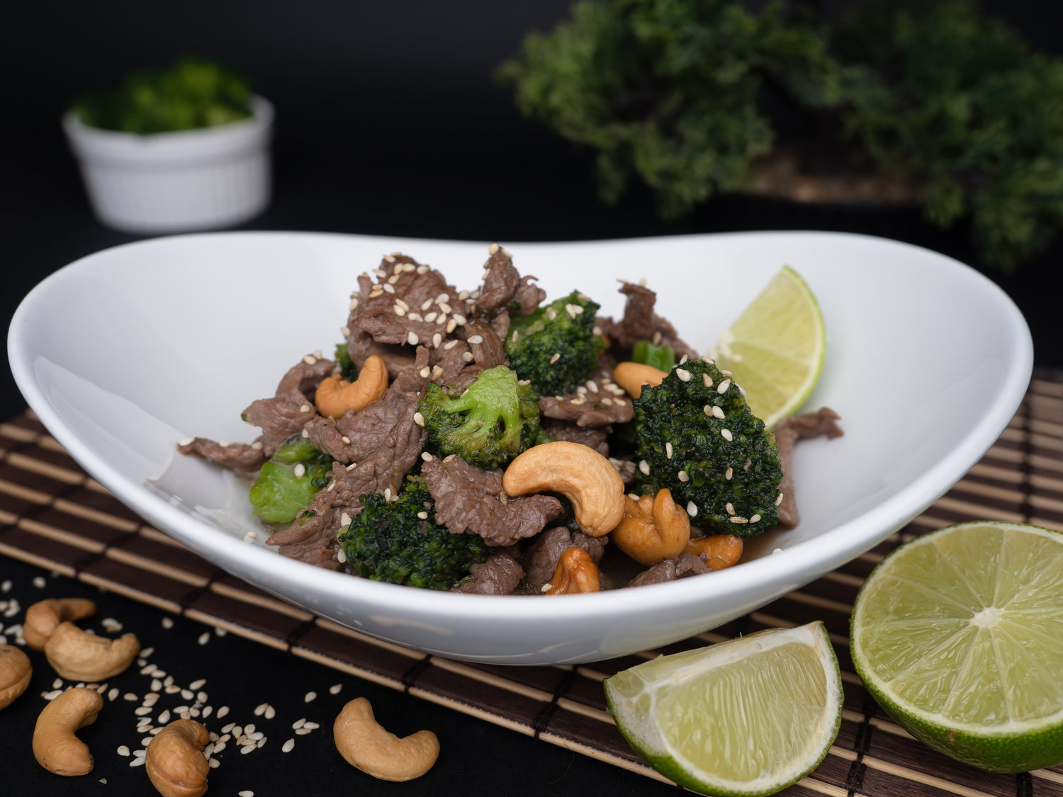 BROCCOLI & CAJU este un preparat tras la tigaie cu caju, broccoli si sos de stridii. Sevit cu Orez Jasmine sau Tăitei. BROCCOLI & CAJU is a stir-fried dish made with cashew nuts, broccoli and oyster sos. Served with Jasmine Rice or Noodles.